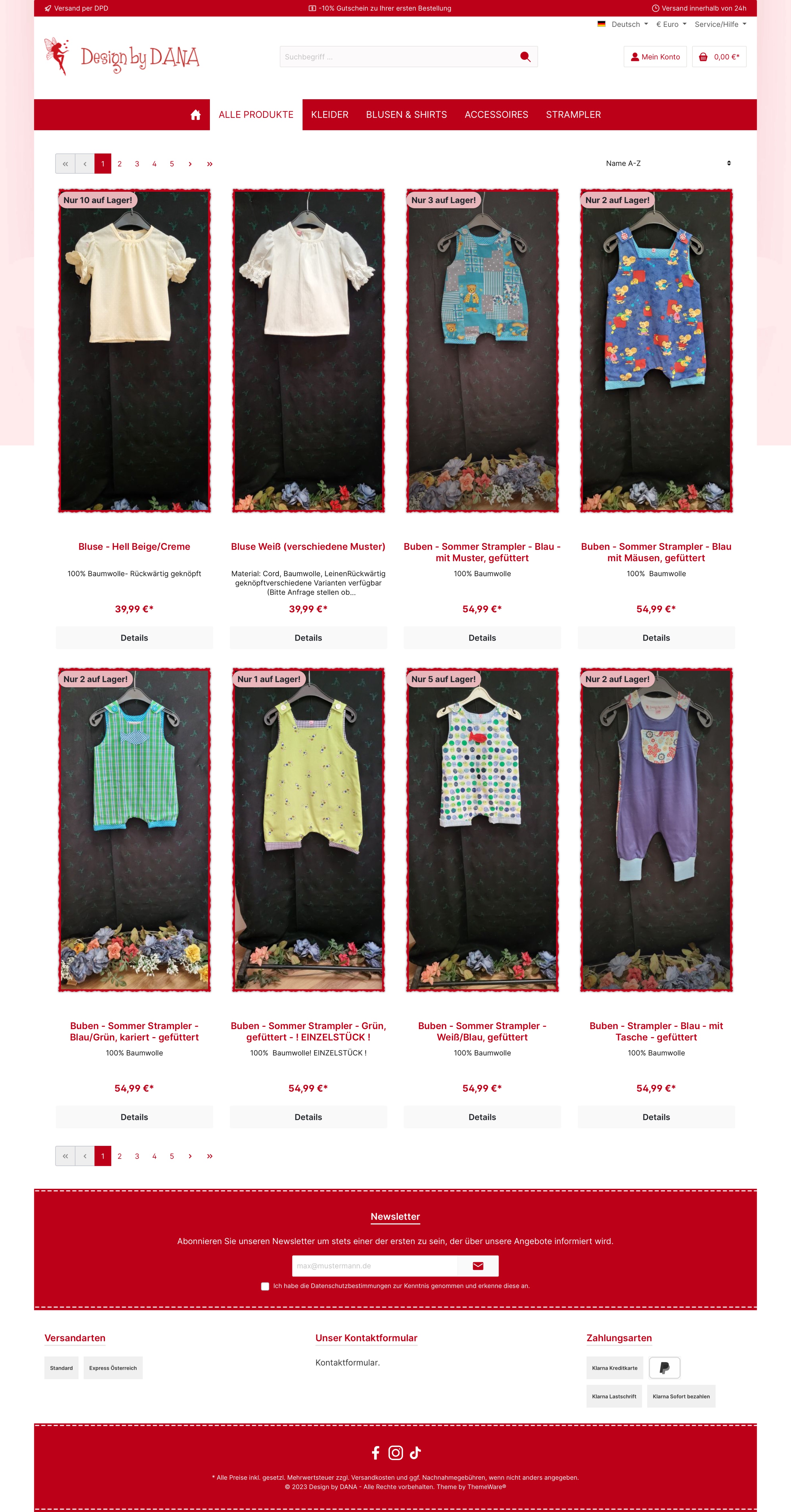 Es wurde ein Online-Shop für Kinderbekleidung erstellt. Die Hauptaufgabe bestand darin, ein maßgeschneidertes Template gemäß den Kundenwünschen zu gestalten. Außerdem wurde ein individuelles Logo entworfen. Zusätzlich wurden Funktionen zur Verwaltung von Währungen, Ländern und Versandregeln erfolgreich integriert, um einen reibungslosen Betrieb des Online-Shops zu gewährleisten. Kunden können nun in verschiedenen Währungen bezahlen, aus verschiedenen Ländern bestellen und von entsprechenden Versandregeln profitieren.